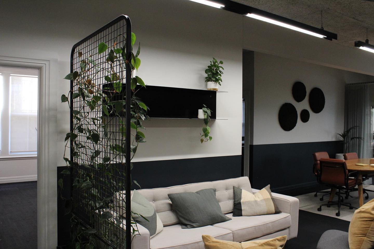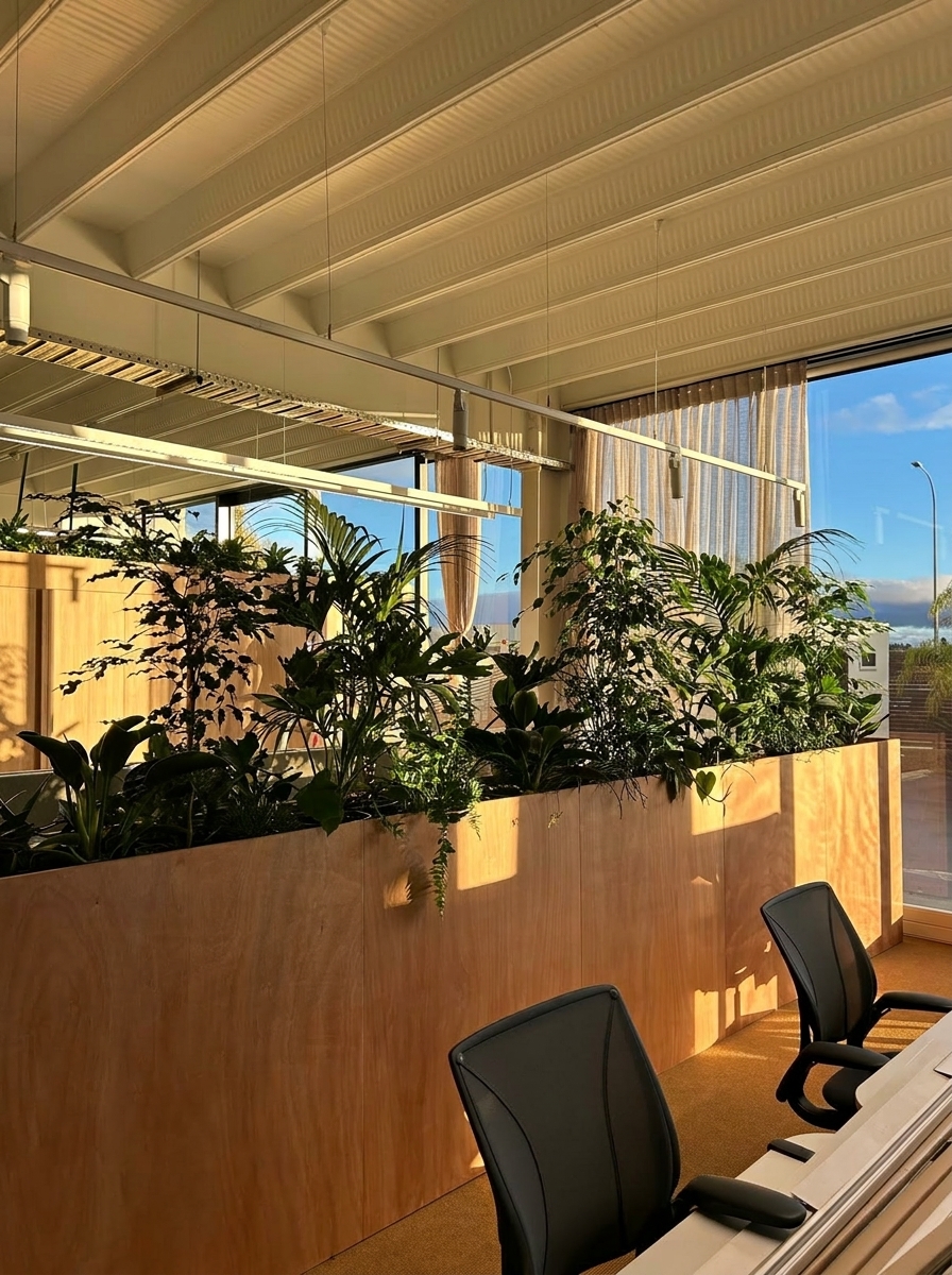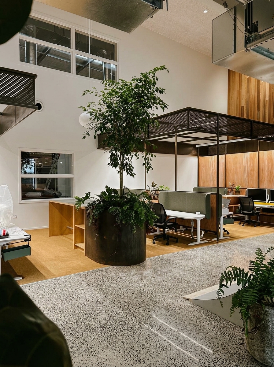 Bespoke indoor plant fit-out across reception, open-plan floor, and breakout. Plywood planter boxes, feature ficus, ongoing fortnightly maintenance.