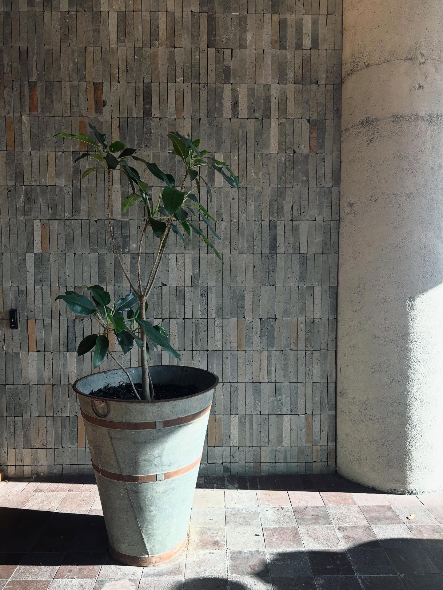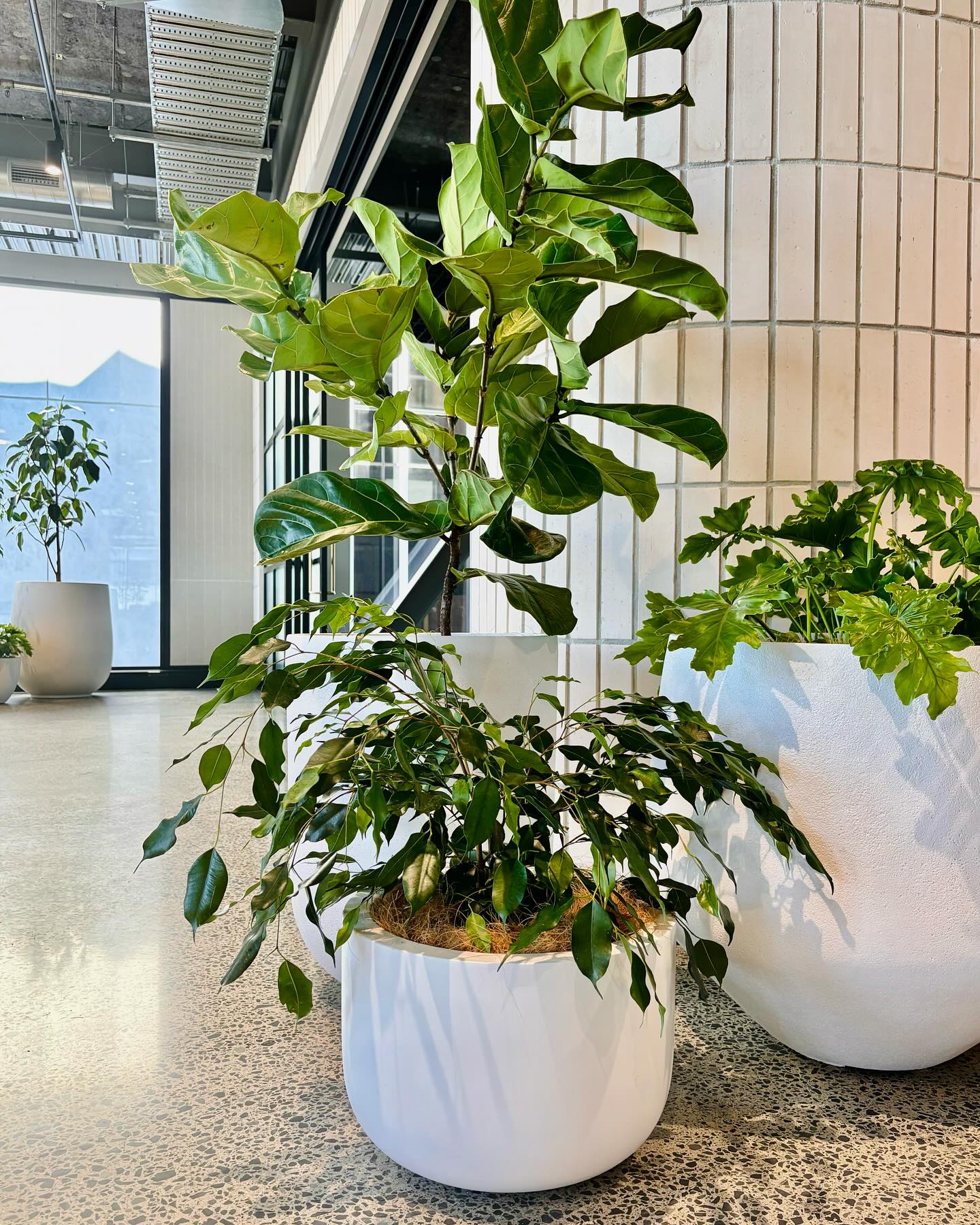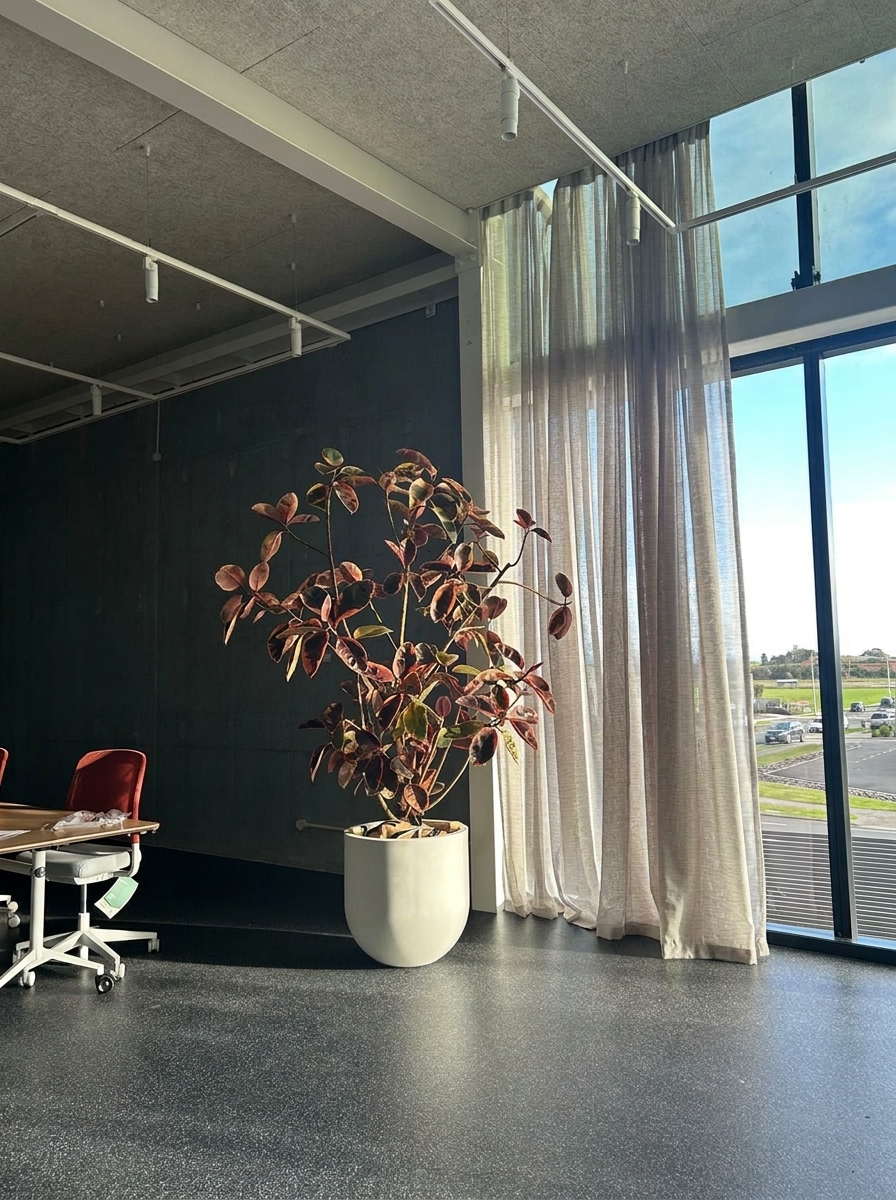 The ficus by reception threw a new growth flush last month, about 40cm on the top canopy. The ferns in the breakout are thriving in the cooler light. The rubber plant on the mezzanine has officially outgrown its pot.